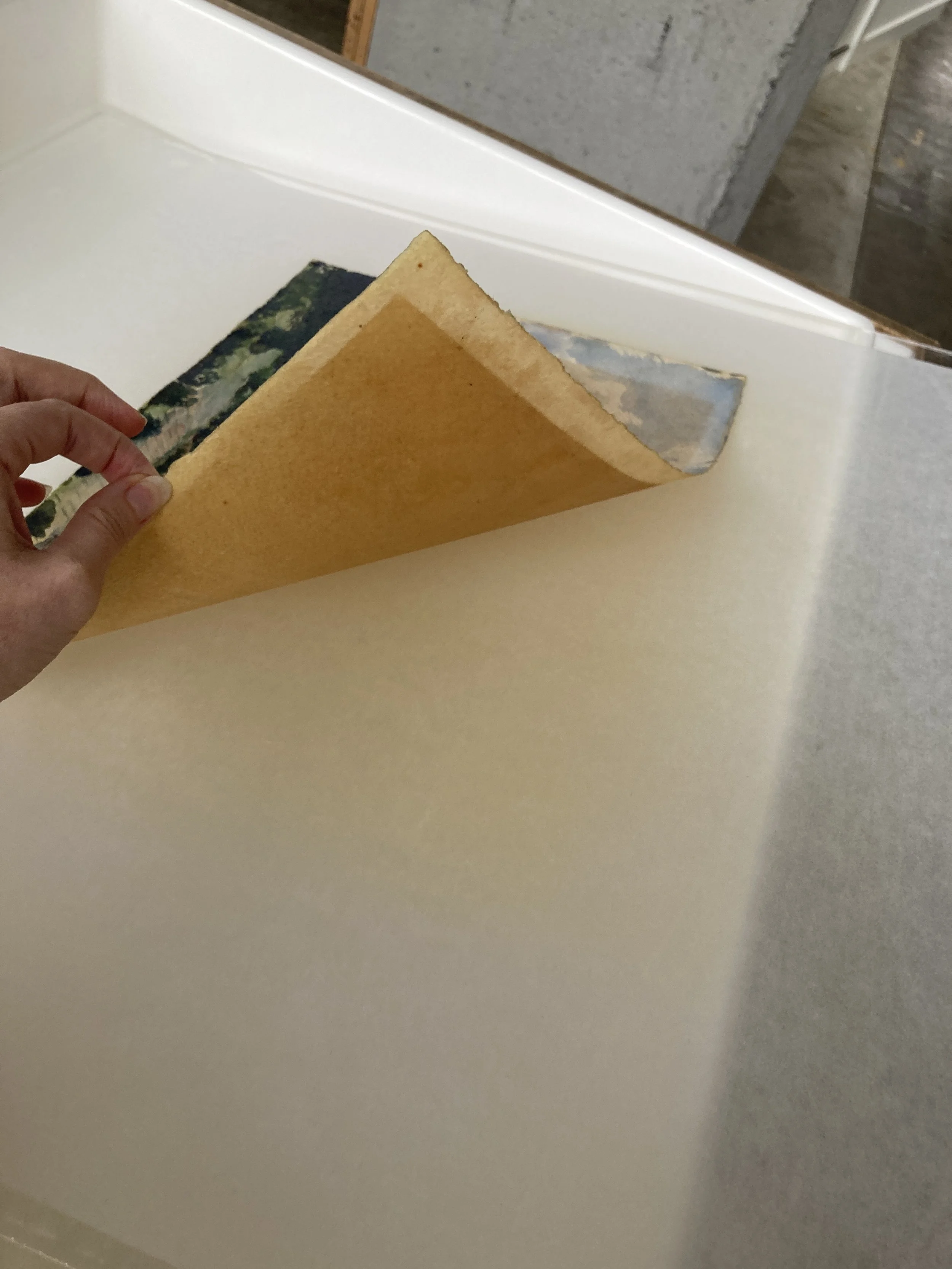 de-framed the painting and manually removed degraded non-archival adhesives and mount windows