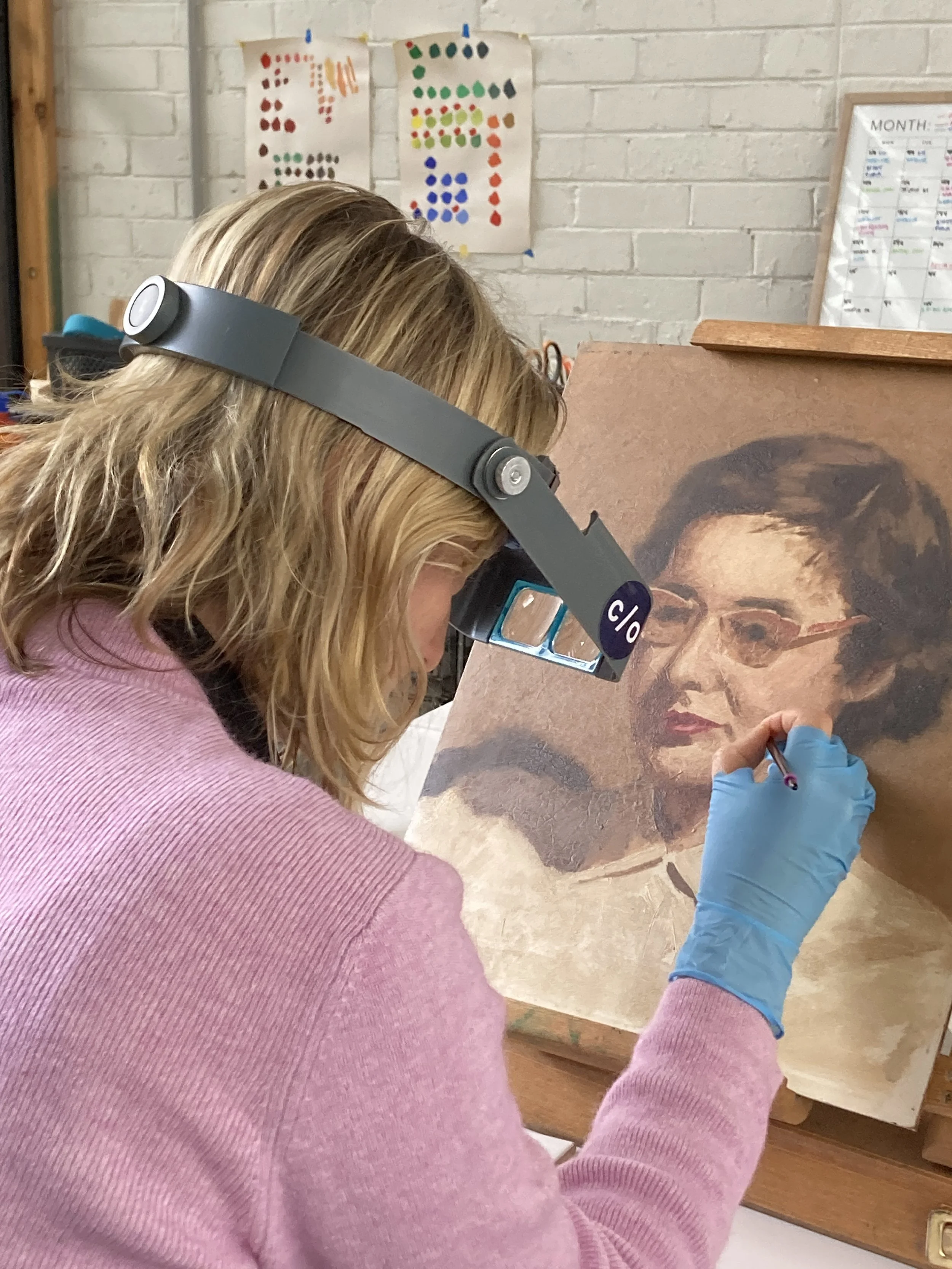 The oil painting exhibited extensive drying cracks across the whole surface due to inherent issues stemming from the inadequate application of the original paint layers. Craquelure was especially pronounced in areas with high concentrations of dark brown pigment, a known siccative, revealing the underlying white preparation layers. The painting also had a layer of surface dust and dirt, an unevenly applied varnish layer, and flaking paint. To restore image cohesion, we completed the following treatments: